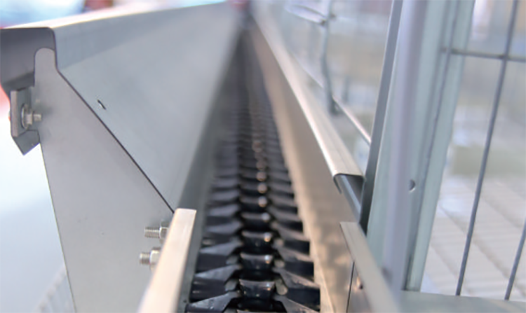 出料口安裝有勻料器、趕雞棒、首尾段殘料回收裝置,減少飼料浪費(fèi)且喂料均勻,喂料量可根據(jù)日齡、雞品種進(jìn)行調(diào)節(jié),保證雞營(yíng)養(yǎng)充足、均衡。